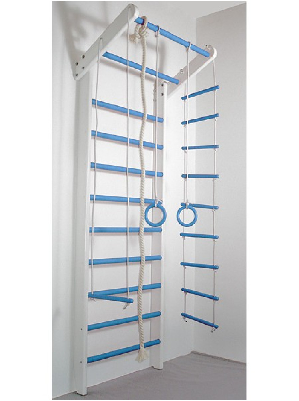 Шведська стінка Аладін складається з шведської стінки і мотузкового набору. Виріб виконаний: боки з сосни, поперечини з бука. Крім того, Ви можете підібрати колір за своїм бажанням. Шведська стінка Аладін стане відмінним подарунком для активних і енергійних діток, які люблять спорт.