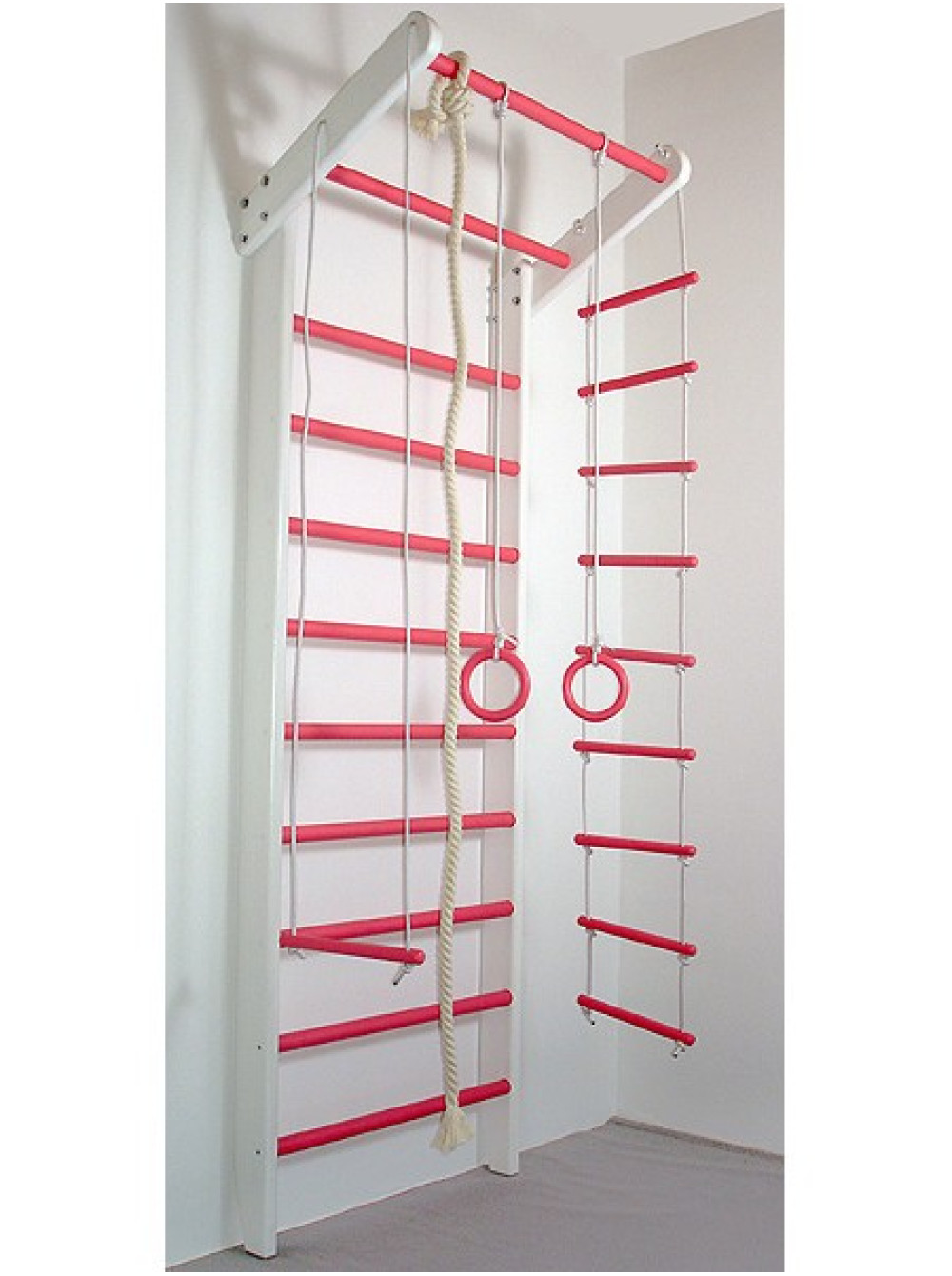 Шведська стінка Сакура - це прекрасний варіант спортивного куточка для вашої дитини, яка любить активні ігри та спорт. Шведська стінка Сакура виготовлена з сосни і бука, в комплект входить: шведська стінка і мотузяний набір.