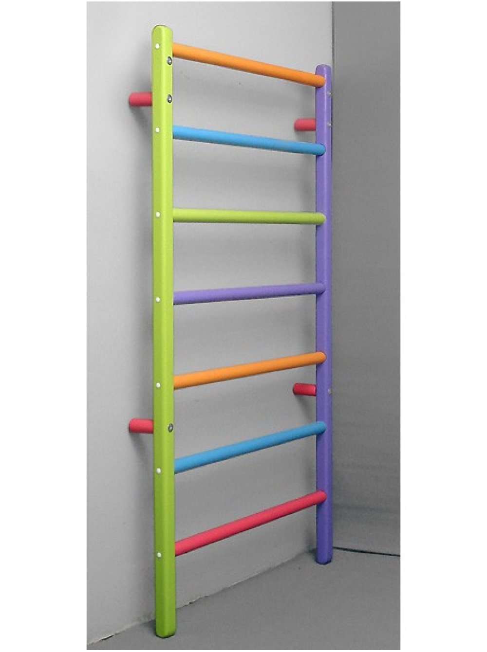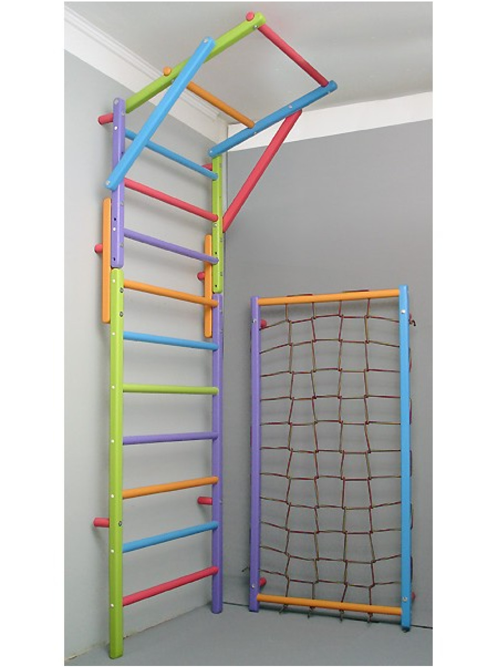 Шведська стінка модульна кольорова, яскрава та якісна, виконана повністю з деревини бука, що робить виріб міцним і не громіздким, до того ж комплекс витримує великі навантаження. Верхній турнік з рукоходом може бути прикріплений в трьох положеннях по нахилу і висоті.