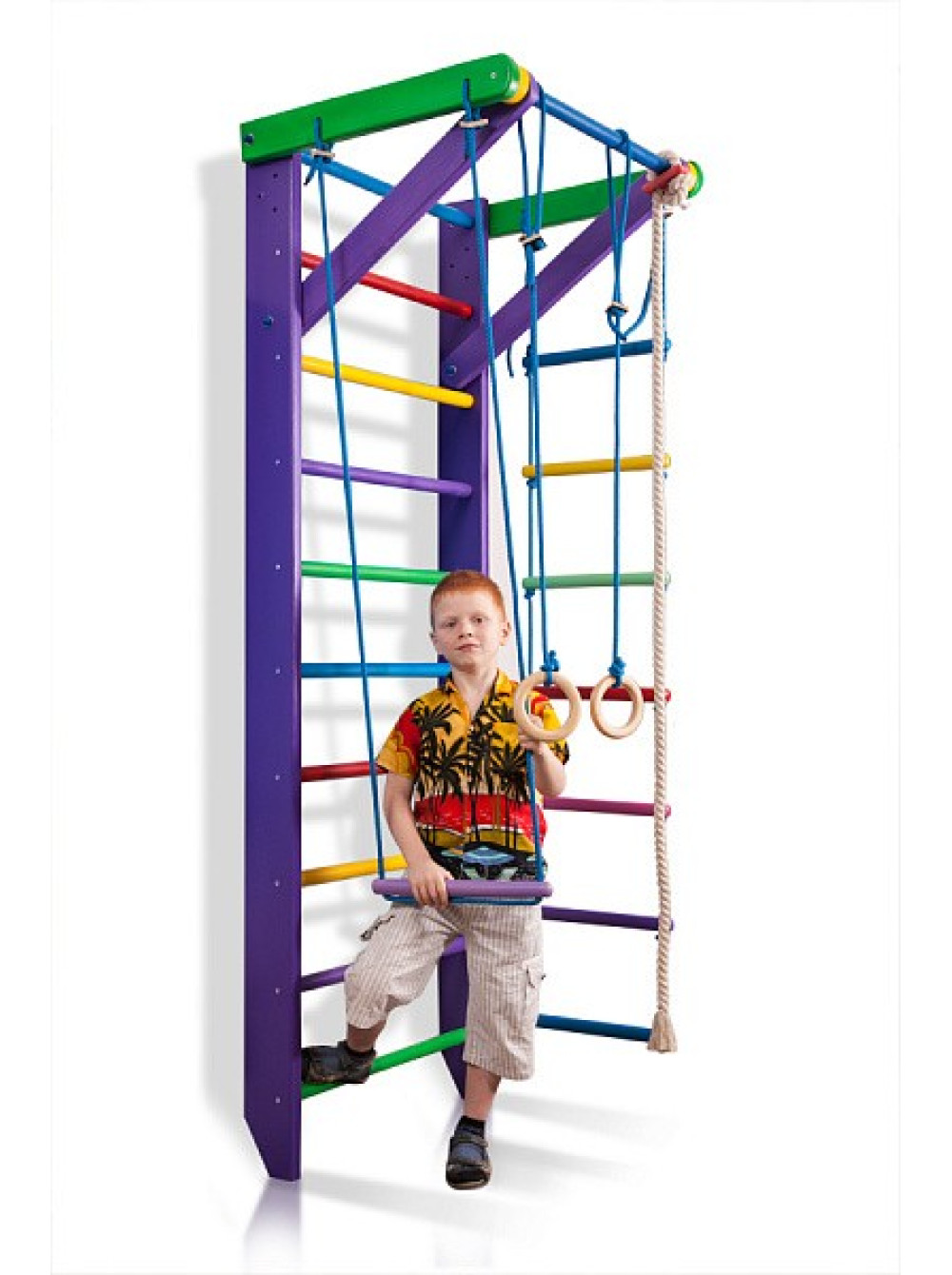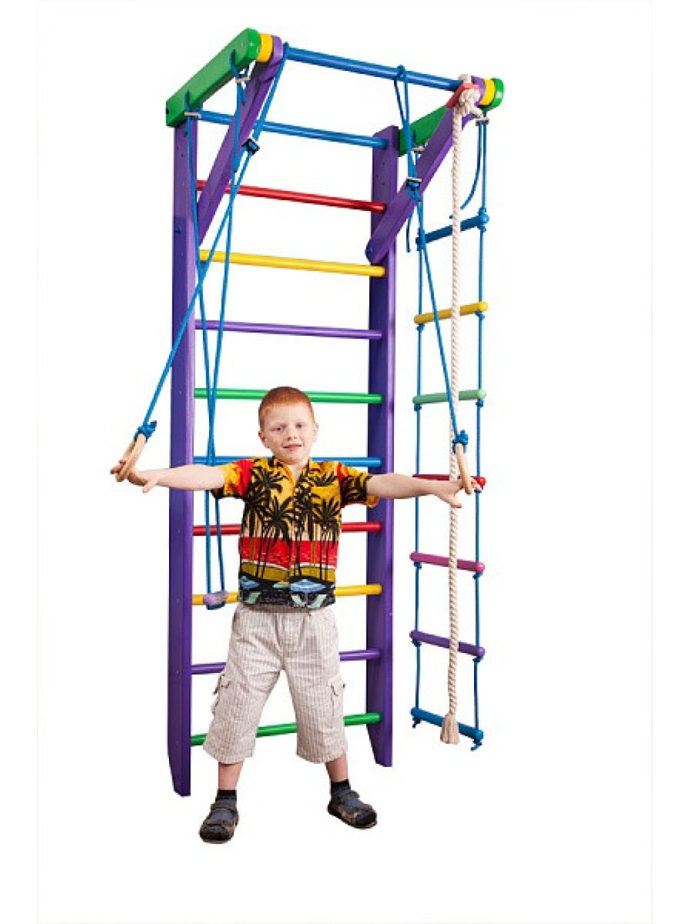 Куточок розрахований на діток у віці від двох-чотирьох років і буде придатний для використання аж до закінчення школи і навіть більше. Тут є багато навісних елементів, які допоможуть урізноманітити спортивні зайняття. До того ж є гойдалка-трапеція, де дітвора зможе ще і покататися. Може бути із зеленими або фіолетовими боковинами. На Ваш вибір.