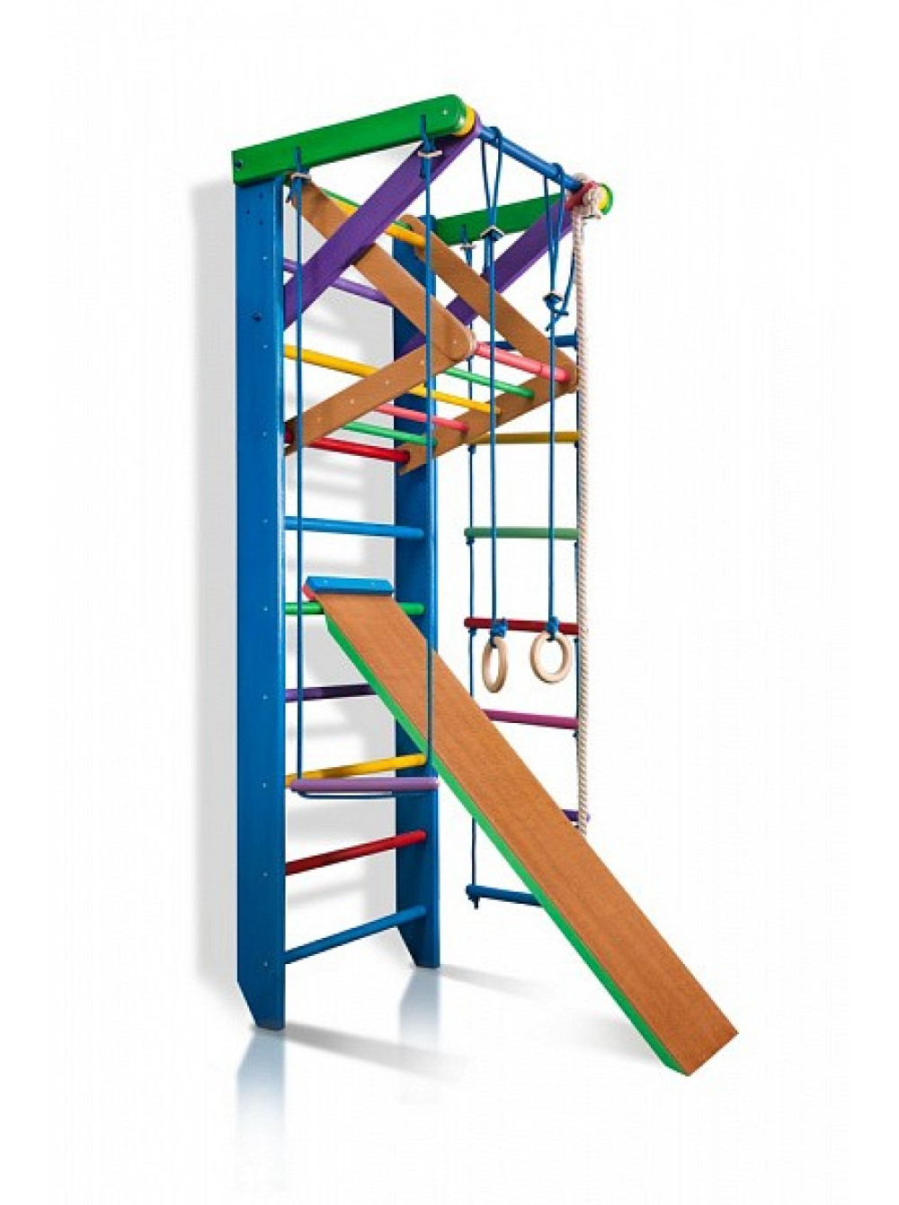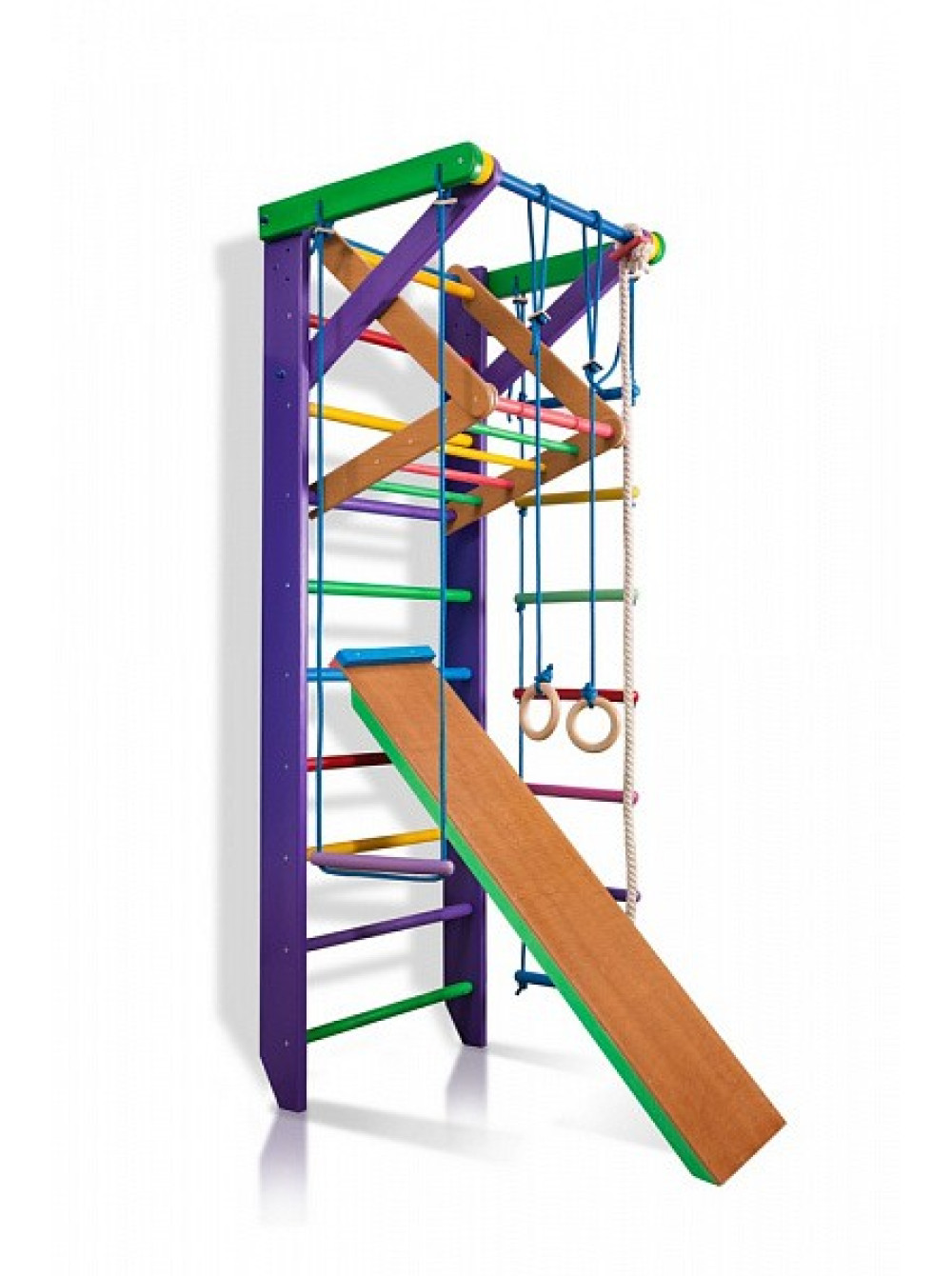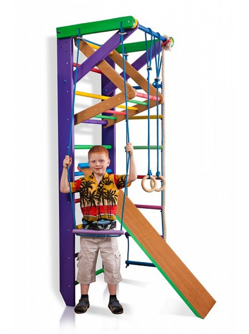 Домашній спорткомплекс Карусель 3-220 - цікава модель для здорового початку трудового дня Вашого чада. Куточок розрахований на діток у віці від чотирьох років і буде придатний для використання аж до закінчення школи і навіть більше. Тут є багато навісних елементів, які допоможуть різноманітити спортивні зайняття. До того ж є качели-трапеція і дошка для пресу, яку за бажання можна використати як гірку. Може бути з синіми або фіолетовими боковинами. На Ваш вибір.