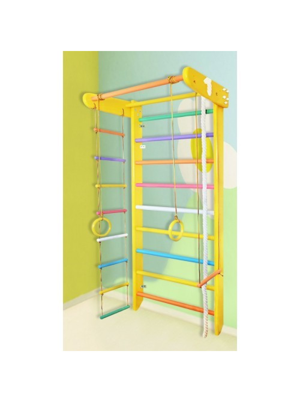 Спортивний комплекс Левеня виконаний на основі всім відомої шведської стінки і доповнений комплектом навісного обладнання. Вдалий варіант стартового набору тренажерів для фізичного здоров'я та активного дозвілля Вашої дитини.