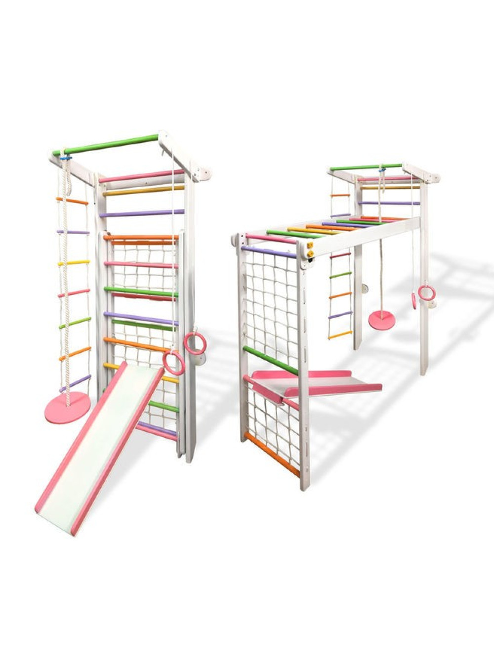 Спортивний комплекс Трансформер з гіркою Ласочка - виконаний у білому кольорі з кольоровими перекладинами в яскравій і ніжній колірній гаммі. Виглядає дуже нарядно! Відмінне колірне рішення для задоволення естетичних потреб ваших маленьких доньок.