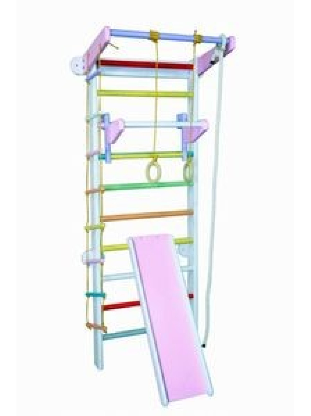Спортивний куточок Марічка з дитячим турніком і гіркою стане гідним і корисним доповненням до меблів будь-якої дитячої кімнати, особливо дівчачої. Традиційна шведська стінка зі стаціонарним турніком вдало доповнена усіма потрібними доповненнями - мотузковим набором, навісним дитячим турніком і звичайно ж гіркою.