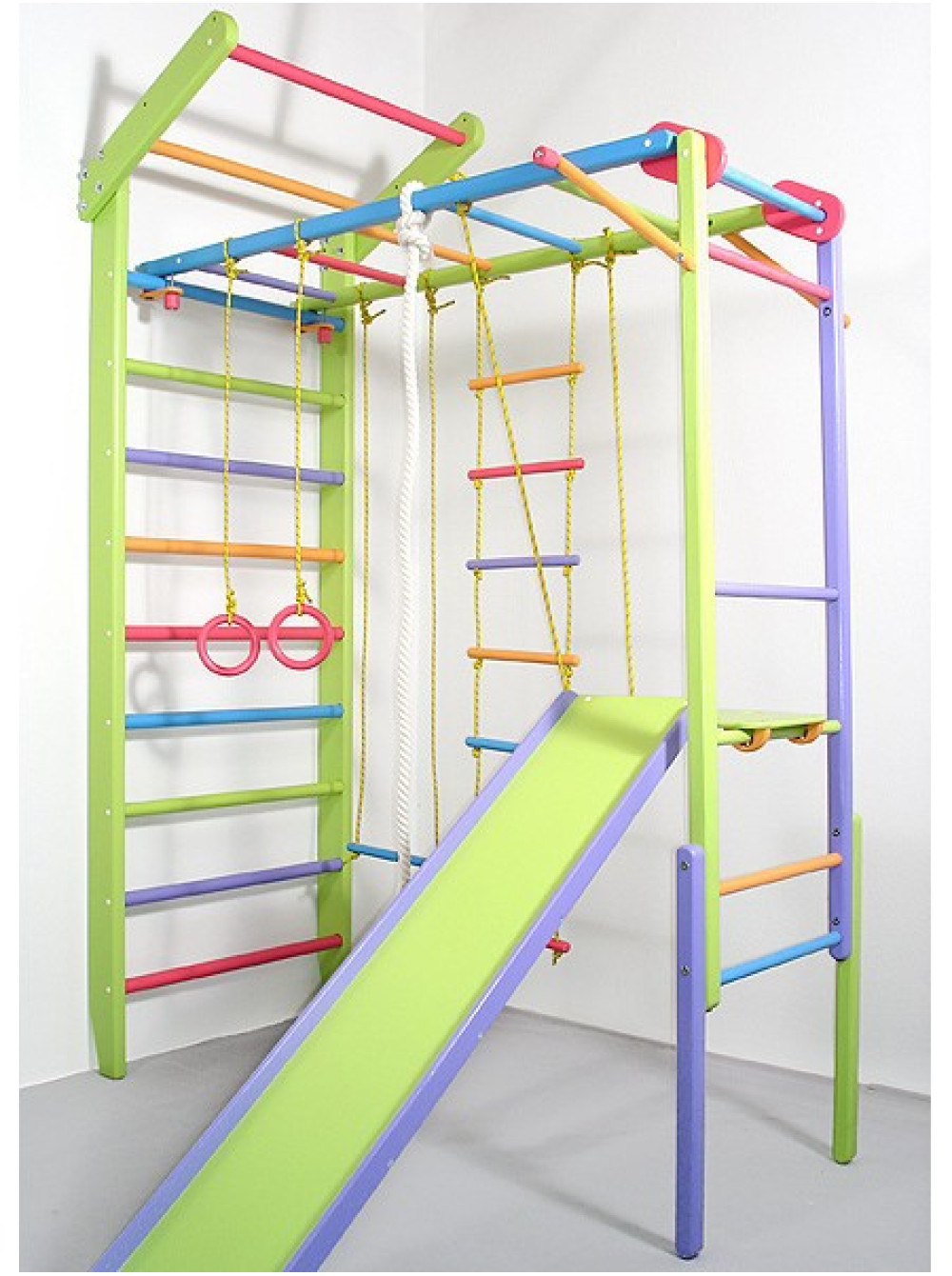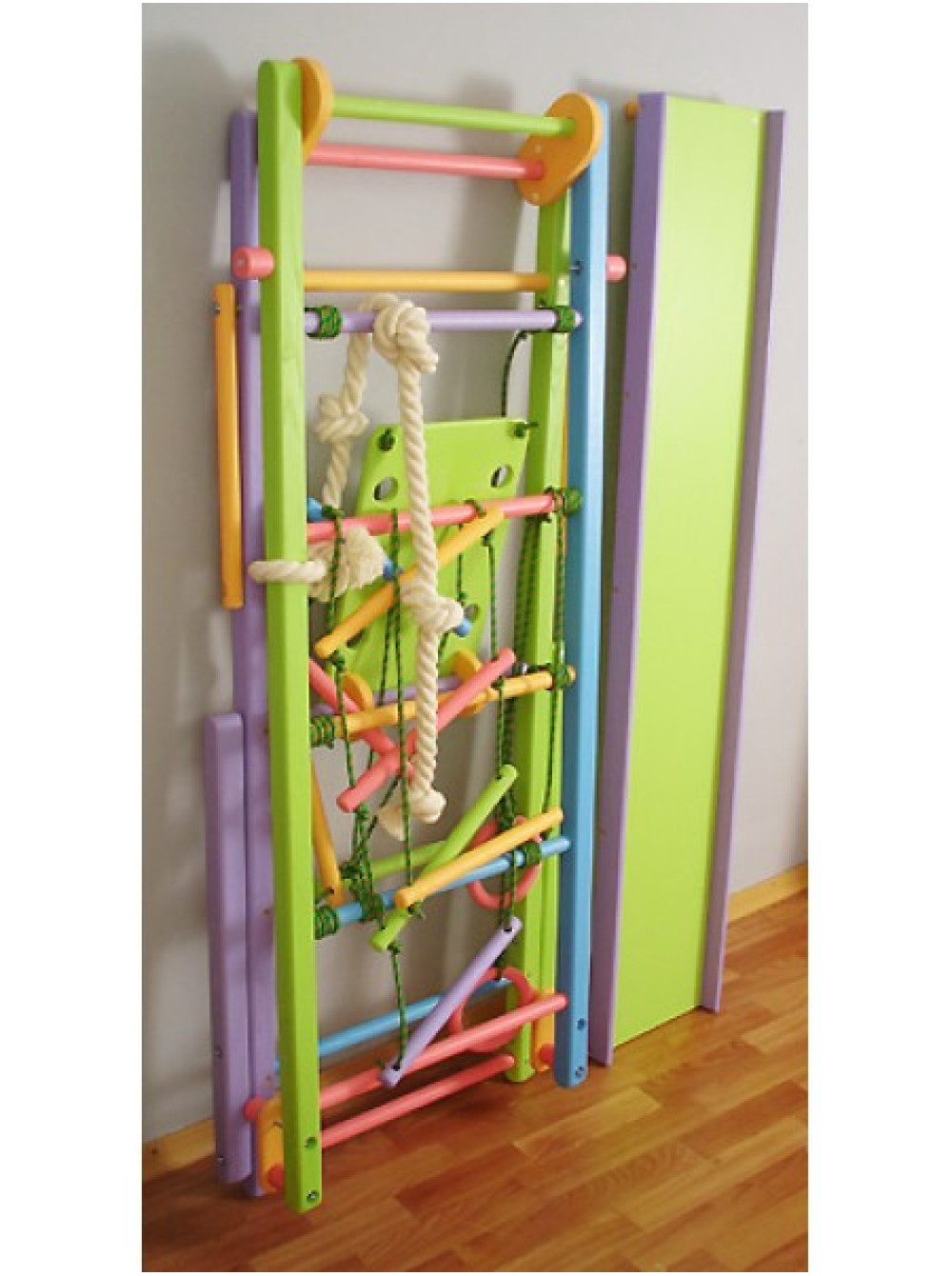 Спортивний куток з рукоходом Бук/Сосна - це дитячий куточок, в який входять такі елементи, як: шведська стінка, рукохід з мотузковим комплектом, гірка. Ця модель спортивного куточка виготовлена з вертикальні стійки сходів на стіні - сосни, поперечини - бука, рукохід (всі деталі) - бука. Спортивний куточок з рукоходом Бук/ Сосна прекрасно підійде для невеликої квартири, його швидко можна зібрати і розібрати.
