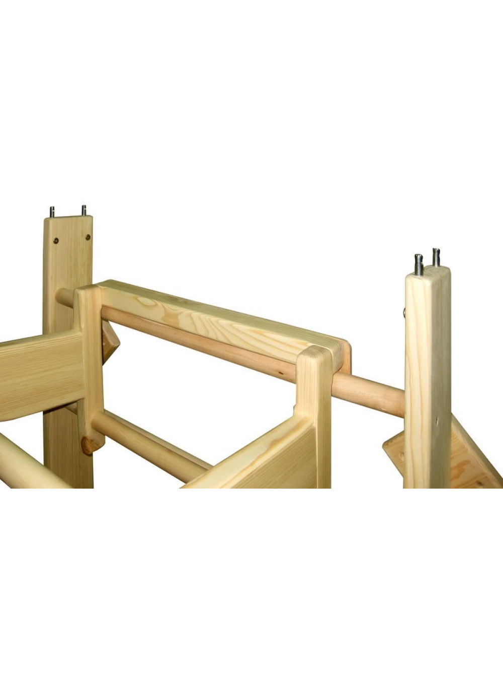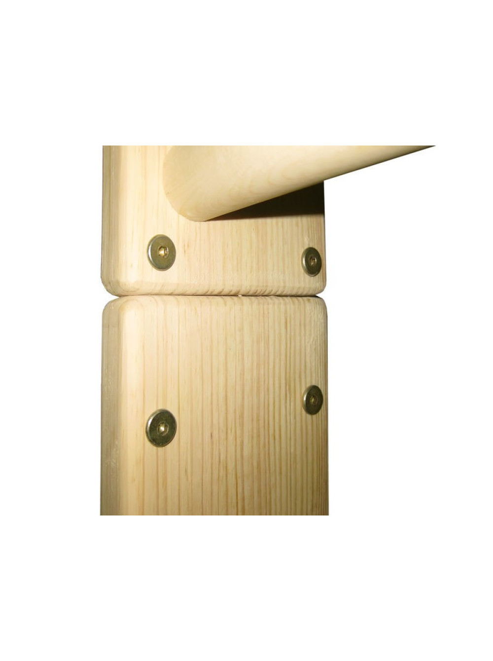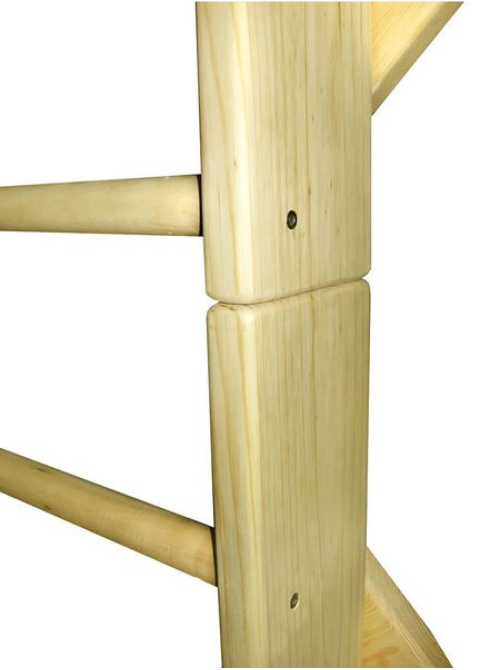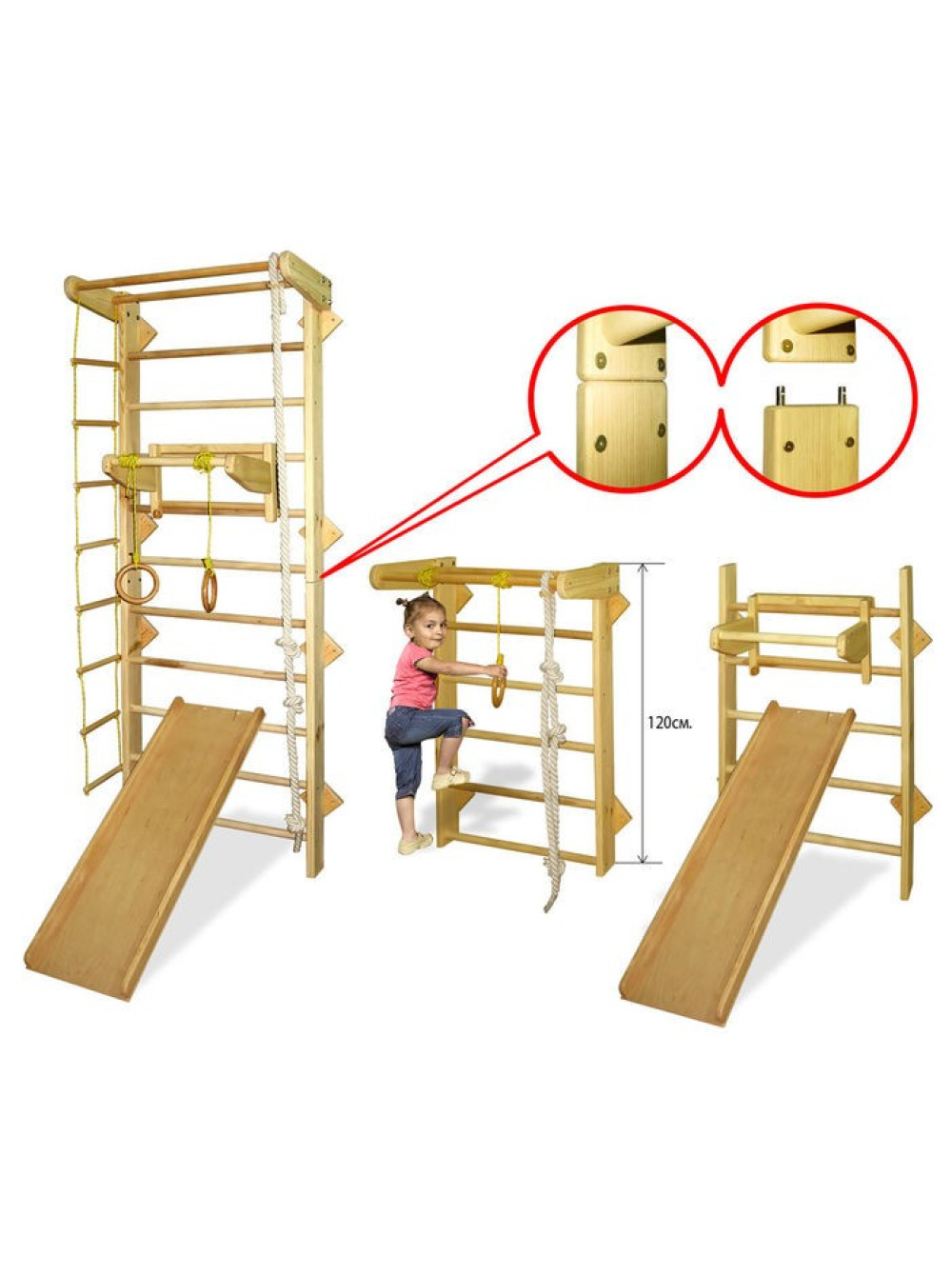 Спорткомплекс виконаний в натуральному кольорі з деревини сосни і твердих порід дерев : буку, ясеня, клена.