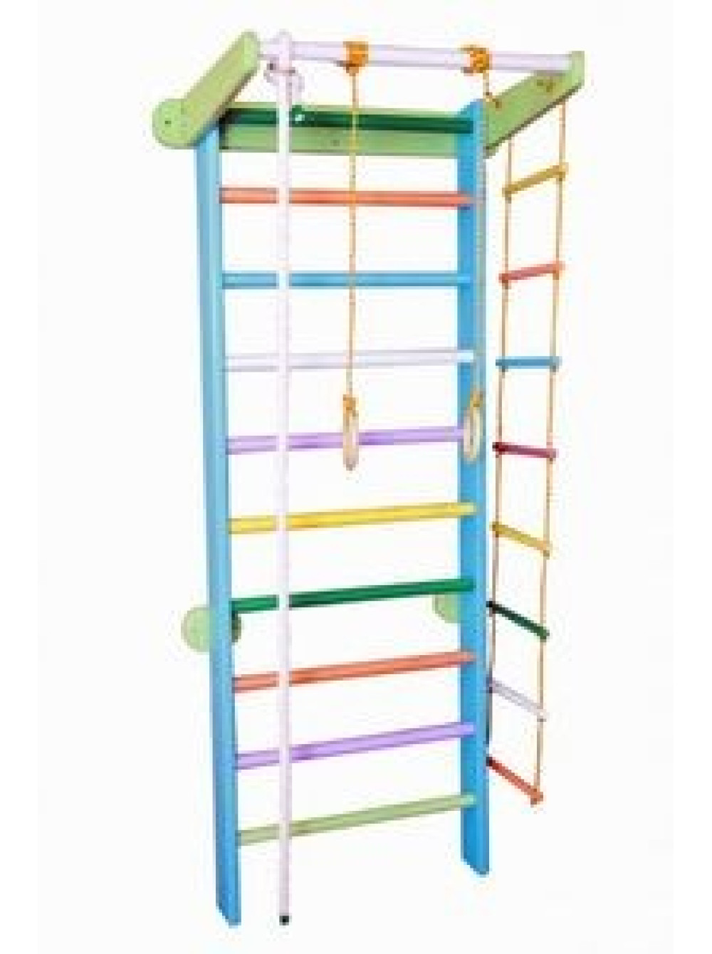 Спортивний комплекс доповнений мотузковим набором, кріпитися до стіни і підлоги стаціонарно.