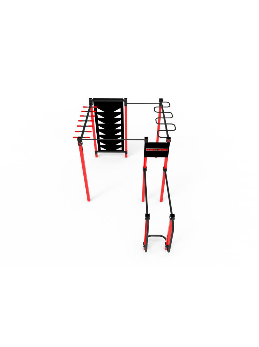 У комплекті кілька турніків, дошка для скелелазіння, бруси і рукохід.