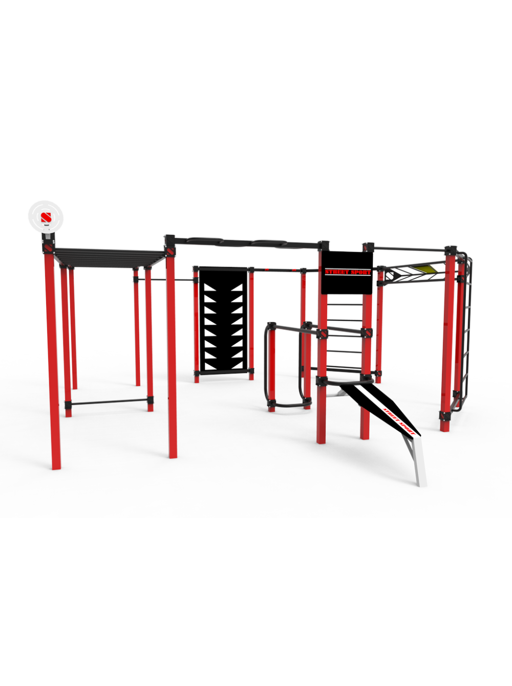 Воркаут для спортивного майданчика S-30 - ідеальна конструкція з великим набором спортивних і гімнастичних елементів. Також комплекс доповнений вельми популярним останнім часом тренажером - лавою для преса.