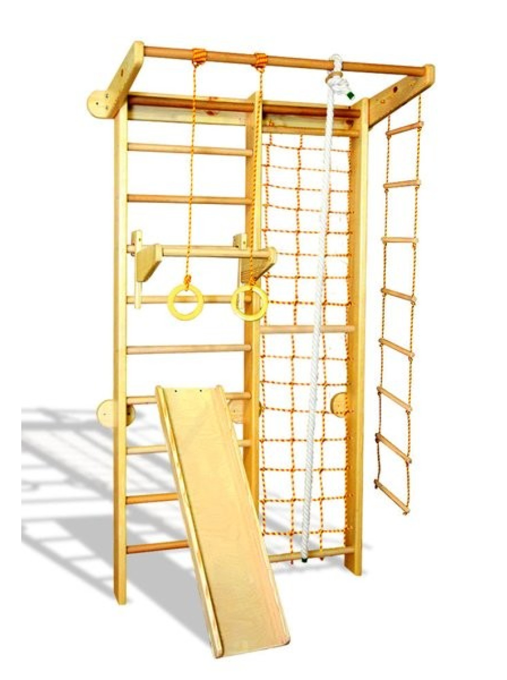 Спортивний комплекс Комбі сосна з гіркою - спортивна стінка, в якій скомбіновані кілька гімнастичних елементів: шведська стінка, піратська сітка, дорослий та дитячий турніки, гірка або дошка для преса. Виконаний в натуральному кольорі сосна. Буде корисний для дітей різного віку, також на ньому зможуть займатися і дорослі.
