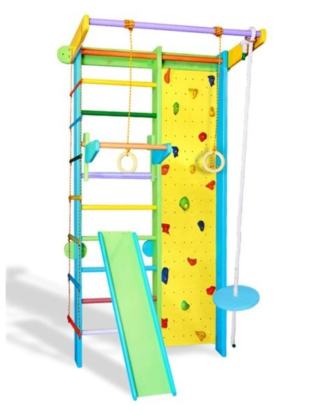 Спорткомплекс Комбі із скалодромом кольоровий ПК - в повній комплектації з дитячим турніком і гіркою один з найпопулярніших спортивних куточків у наших покупців. І це не дивно, адже це не лише модний і відносно "молодий" спортивний елемент, але і міні-формат визнаного у всьому світі виду спорту - скелелазіння.
