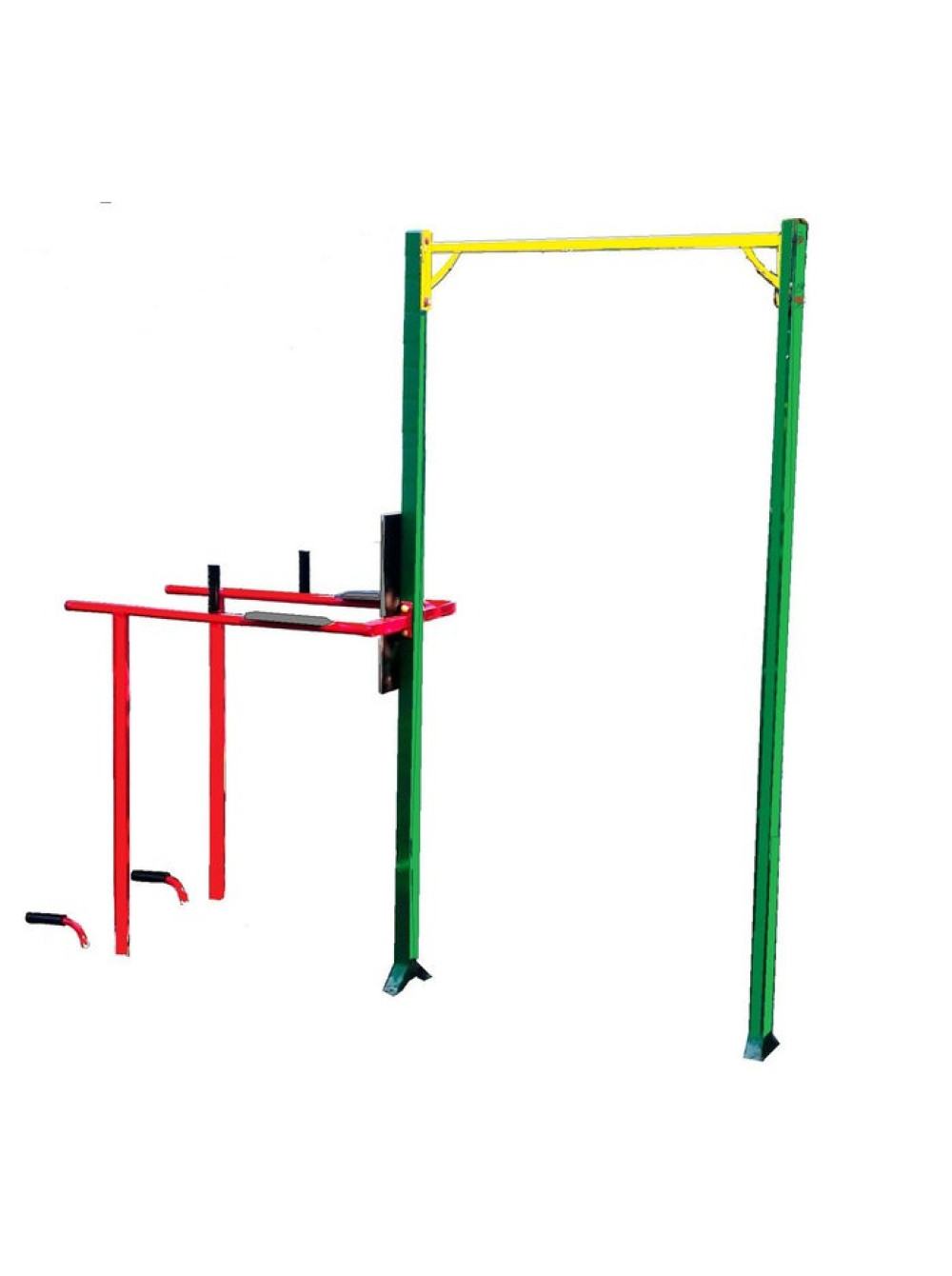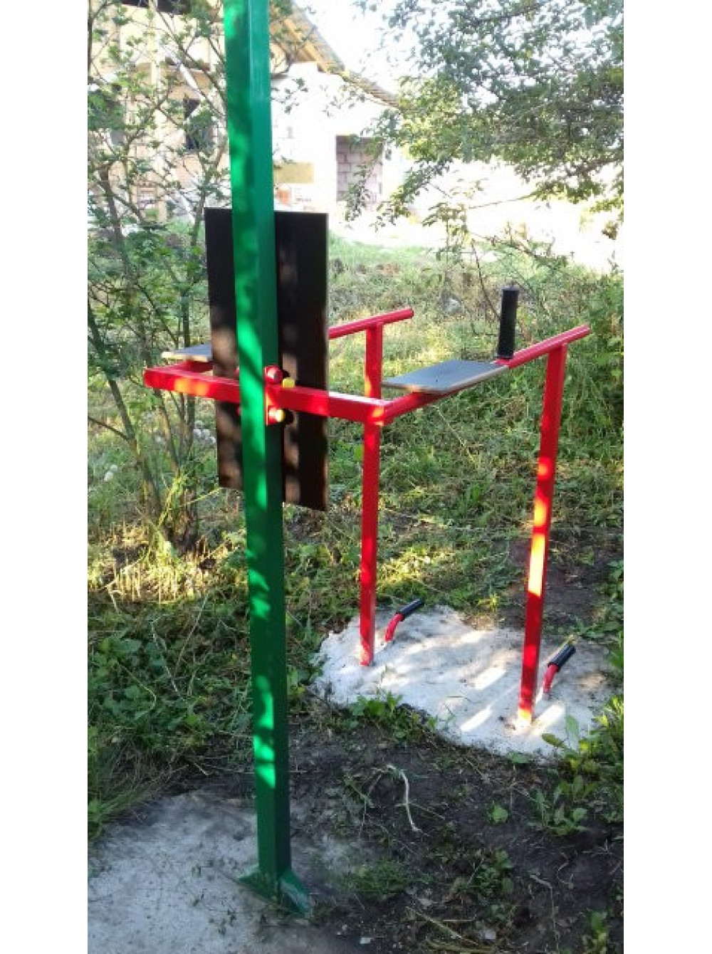 Комплекс виконаний з металевих стійок (профіль 60х60 см, стінка 3 мм) і металевого турніка (діаметр 30 мм, всередині уварений сталевий прут), упори з вологостійкої фанери і покритий полімерними фарбами європейського виробництва, що робить його стійким до впливу навколишнього середовища і різних погодних умов.