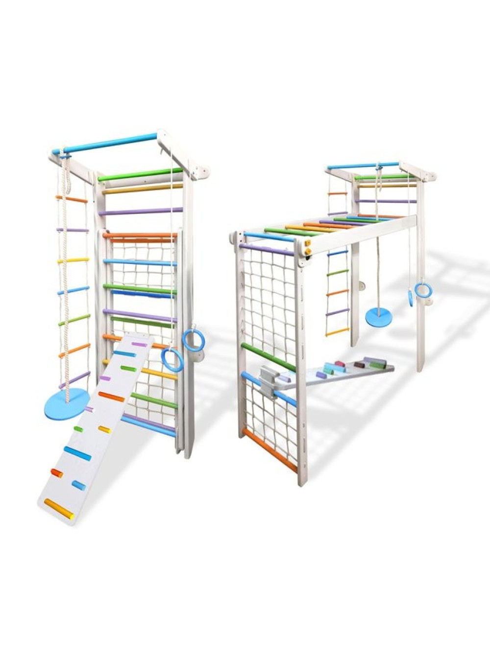 Спортивний комплекс Трансформер Лускунчик з дошкою ребристою - виконаний у білому кольорі з різноколірними перекладинами в яскравій і барвистій колірній гаммі. Виглядає дуже нарядно! Відмінне колірне рішення для задоволення естетичних потреб дітей і їх батьків.