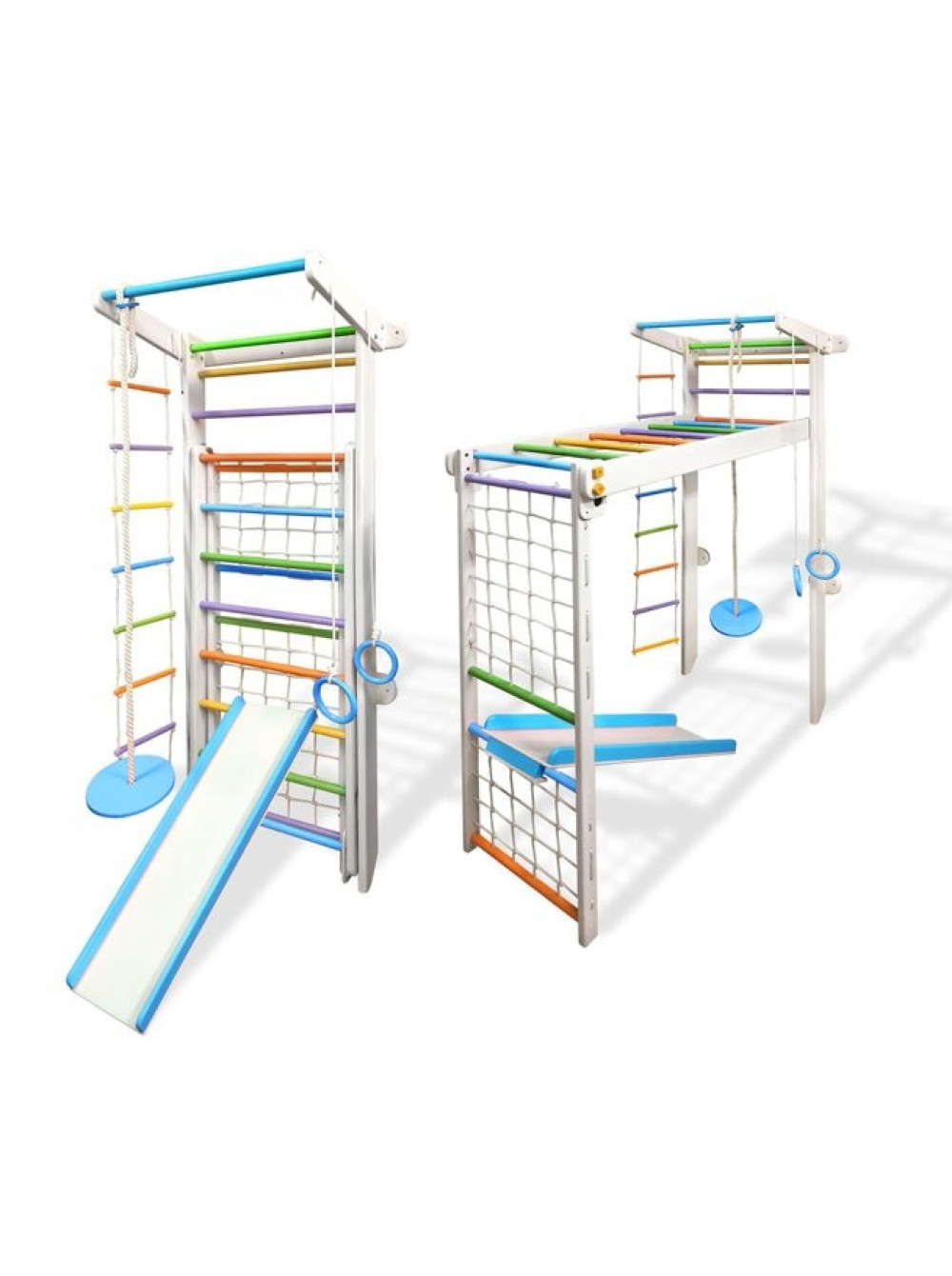 Спортивний комплекс Трансформер Лускунчик з гіркою - виконаний у білому кольорі з різноколірними перекладинами в яскравій і барвистій колірній гаммі. Виглядає дуже нарядно! Відмінне колірне рішення для задоволення естетичних потреб дітей і їх батьків.