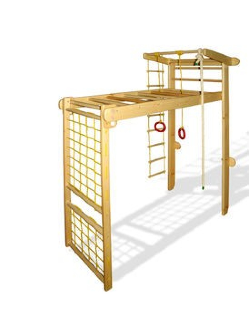 Спортивний куточок Складний з рукохідом Сосна об'єднує в собі три спортивні снаряди: шведську стінку з турніком, сітку для лазіння і рукохід.