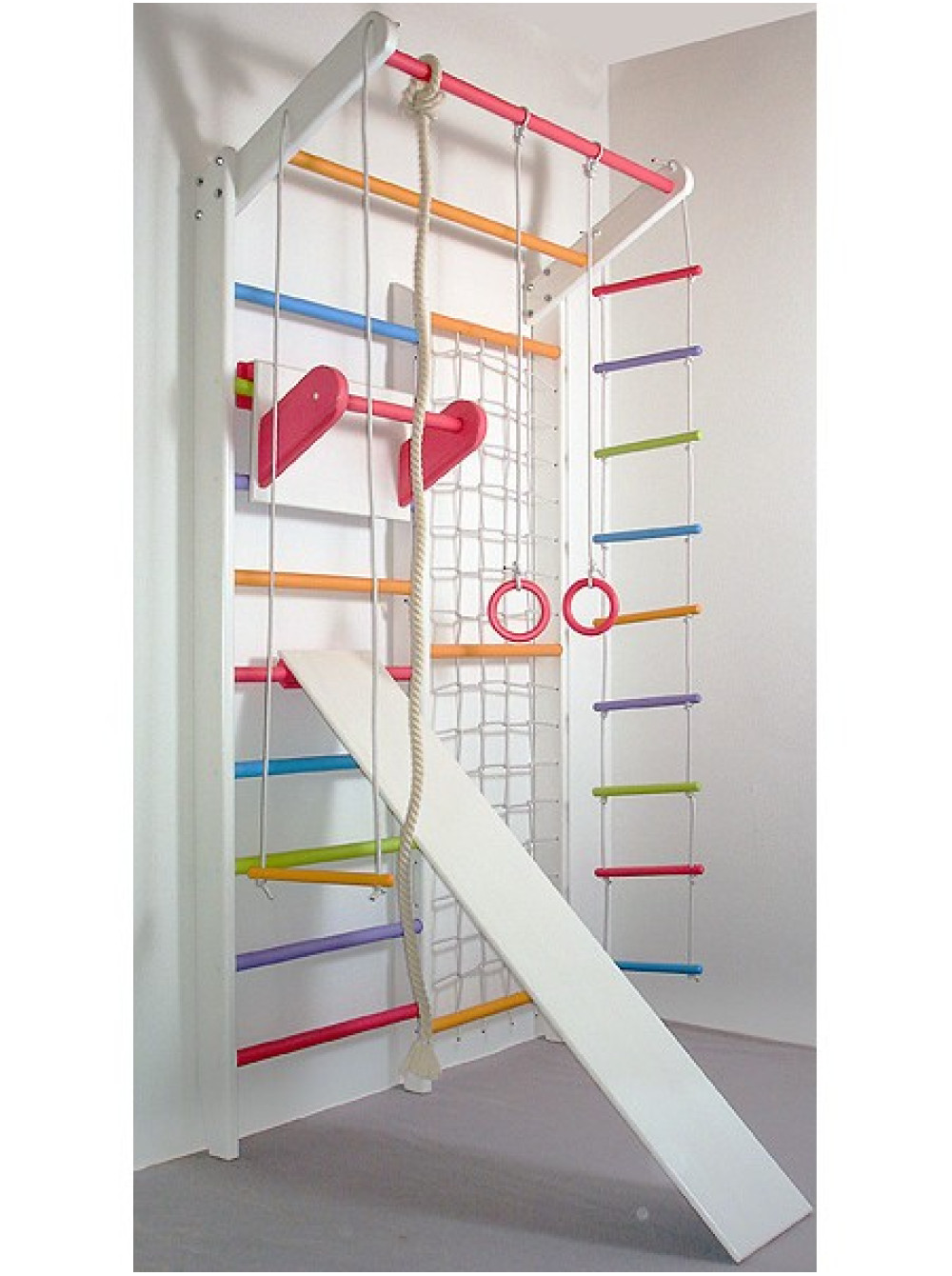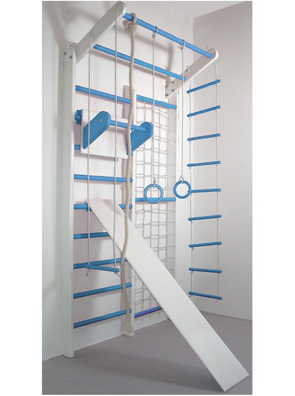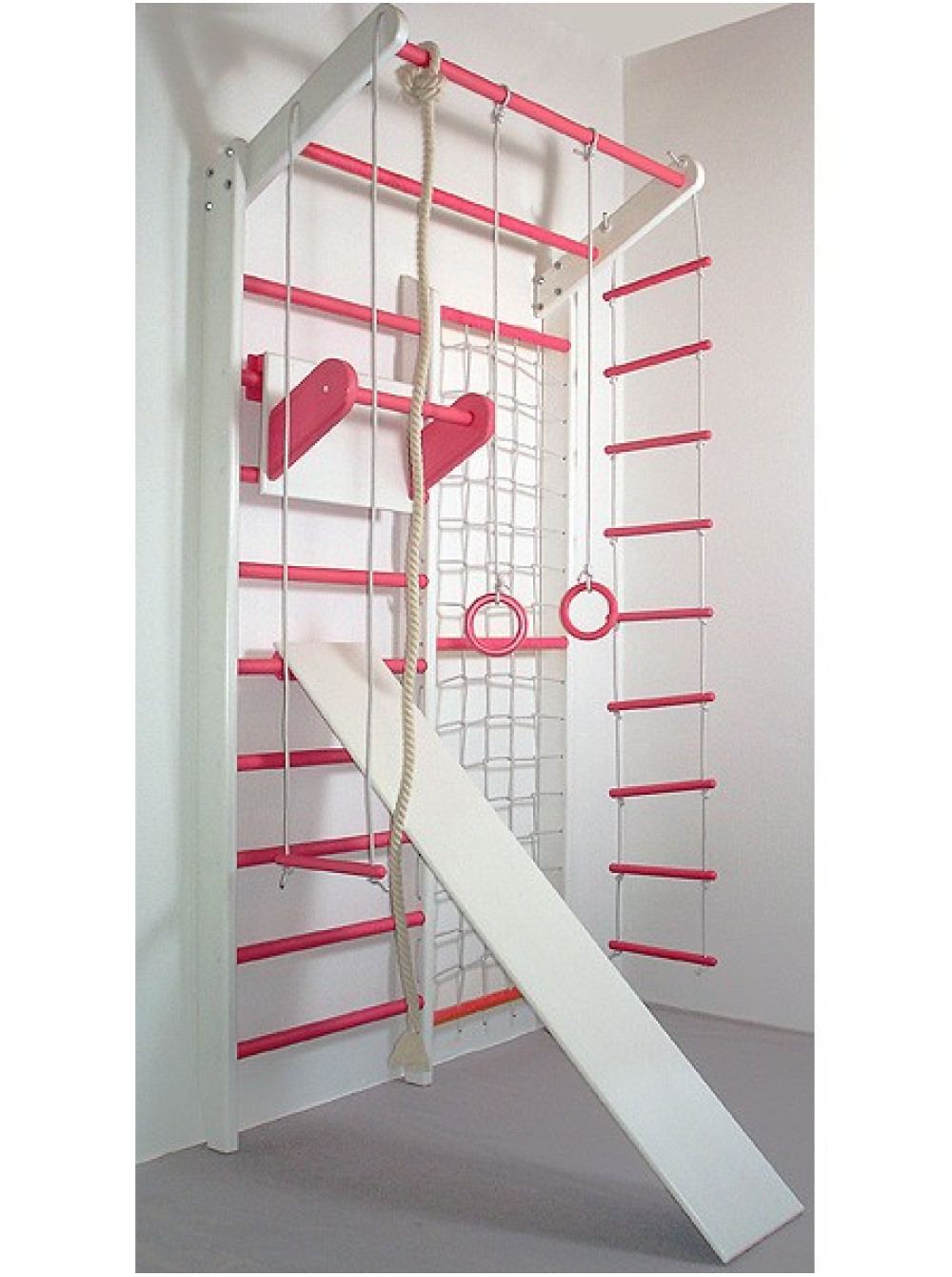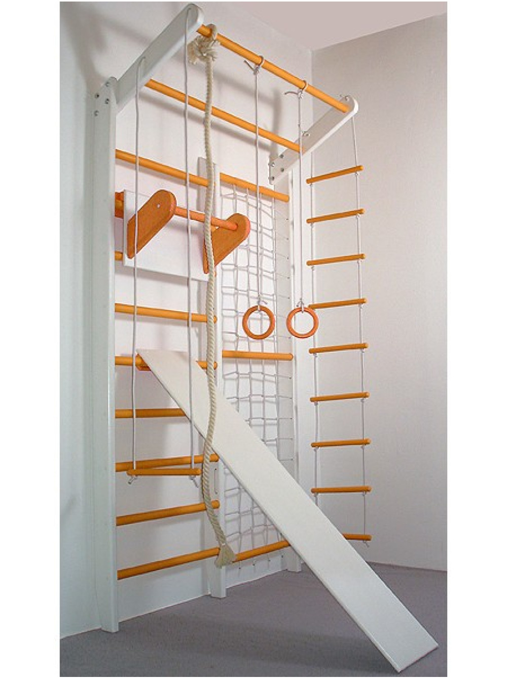 Спортивний комплекс Комбі Алладін Максі комплект стане прекрасним придбанням як для дитячої кімнати, так і для садочка або школи. Купивши спортивний комплекс Комбі Алладін Максі комплект, Ви отримаєте шведську стінку з сіткою, мотузковий набір, дошку і турнік. Ця модель виготовлена з сосни і бука, при цьому є можливість підібрати будь-який колір на ваш смак.