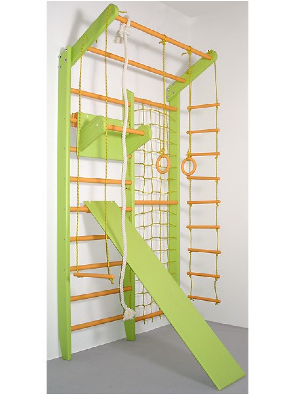 Спортивний комплекс Комбі Пітер Пен Максі комплект складається зі шведської стінки з сіткою, мотузкового набору, дошки і турничка. Цей спортивний комплекс виготовлений з таких порід дерева: сосна і бук, в яскравих кольорах, які обов'язково припадуть до душі як хлопчикам, так і дівчаткам. Замовивши такий спортивний комплекс в якості подарунка, Ви неодмінно зробите життя вашої дитини більш яскравим і активним.