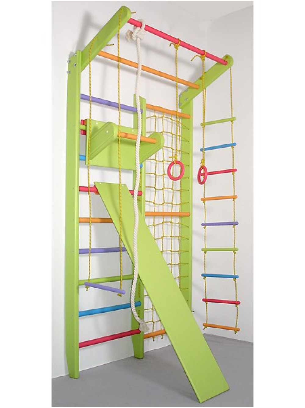 Спортивний комплекс Комбі кольоровий Максі комплект підійде як діткам молодшого віку, так і старше. Такий спортивний куточок допоможе розвинути м'язи тіла і рук, поліпшити координацію і загальний стан організму. Спортивний комплекс Комбі кольоровий Максі комплект складається зі шведської стінки з сіткою, мотузкового набору, дошки і турніка і виконаний з сосни та бука.