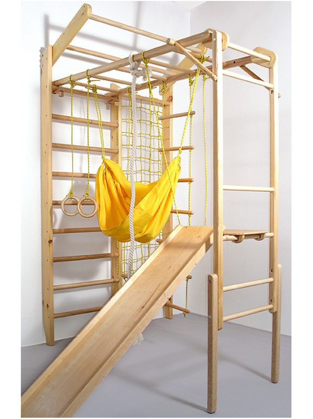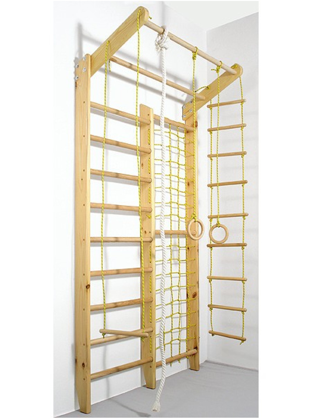 Спортивний куточок Комбі сосна - це спортивний комплекс, що складається зі шведської стінки з сіткою і мотузкового набору. Такий спортивний куточок стане відмінним місцем для спортивних занять і активного проведення часу. Спортивний куточок Комбі сосна можна додатково доукомплектувати, вибравши найбільш вподобані елементи.